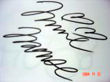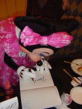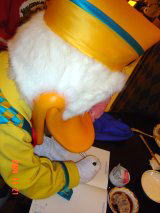 画用紙とサインペンを持っていっておいて、テーブルに回ってきたキャラクターにお願いするとスラスラとサインをしてくれます。とくにお勧めはプルートです。キャラクターの中の人の目の位置が高い位置になっているようで、結構苦労して書くことになります。ちょっと笑えます。 |