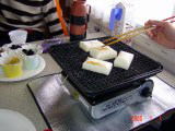 お正月なので、少しだけおせち料理を持ってきたので、それを出してお餅を焼きました。入れ物は今回も使い捨ての紙製品が中心なので、見た目は今ひとつですが、そこは勘弁をということで。