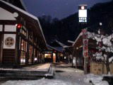 洗い終わって露天風呂に行こうとドアを開けましたが・・・・うひょ〜〜・・・慌てて閉めました。油断していましたが、雪が舞っていてすっごく寒くて驚きました。改めて意を決して外に出て露天風呂に浸かると、湯船から外に出れなくなってしまいました。頭寒足熱で長時間入れますが、身体が温まらないと雪の舞う中寒くて上がれないのです。しばらく浸かって雪の露天風呂を楽しみました。でも頭は雪で冷たかったです・・・・。
