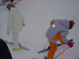 まずは全員がブーツを履くのをお手伝い。わたるは3回ほどスキーの経験があるのですが、今回初めてフロントバックルのブーツなのでやっぱり初心者と同じです。まなのブーツはヤフオクで手に入れたリアバックルのものですが、これは履かせるのも楽チンでした。子供はリアバックルのほうが良いですね・・・。でもわたるのは(奥さんのも)新品ですが1,490円のさらに10%引きで購入できたものなので文句は言えません。ブーツが履けたら、袖やズボンのすそから雪が入らないように調整して・・・と細々と教えます。う〜ん準備に時間がかかりますね〜。