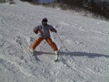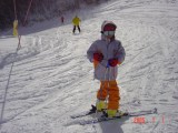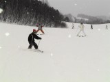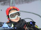 しかし、その反面、スピード感を気にしない子供達には本当に驚きました。とくにまなは初めてとは思えない滑りになってしまい、ボーゲン直滑降を駆使して、リフトに乗っては滑り、乗っては滑りを繰り返していました。その滑り方はしっかりと手を開いて、安定して滑っているので、黒い星が滑り降りてくるという感じで、一目でまなと判るものでした。ゆっくりと滑りながら練習をしている私達の横を何度も追い抜いて滑っていきました。全く子供の習得力の高さというのはすごいものです。大人が苦労しているのに、子供はスイスイと滑っている違いは、