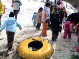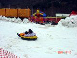 リフトを変えて結局7本ぐらい滑ったところで、子供達がチュービングにチャレンジすることになり、スキー板をゲレンデの隅の雪面にさしておいて、一度ATOMに戻りました。奥さんがゆっくりと「バグズライフ」のビデオを見始めていたときに戻ってしまったようでした。今からキッズタウンにチュービングに行くという話をすると今度は奥さんも行くということになりました。インターネットで取り出しておいた割引券の出番です。700円が500円になります。子供達はスキーブーツのままではつらいと思ったのですが、なんと子供達のスノーシューズを持ってくることを忘れていました。ATOMに積んだままと思っていましたが、子供達は前回ATOMから帰宅するときに履いて降りたので家に置いて来ていました。失敗しちゃっいました。わたるは奥さんのスノーシューズを借りることになりましたが、まな