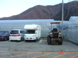スキー場駐車場に到着。入口の近くで他の車の邪魔になりにくい隅にATOMを停めました。後ろがイチゴのビニールハウスという本当にスキー場?という不思議な構図です。隣は除雪用のブルドーザーです。でも農場に停めていますと言っても納得できそうな絵です。