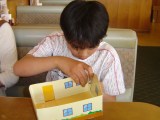 公園で小一時間遊ばせました。それではそろそろ出発です。お昼ごはんの時間なので、帰り道で久しぶりにファミレスに寄ることにしました。子供の希望で○コスに寄りました。ここはドラえもんをキャラクターで使用しているようです。子供達はドラえもんのクラフトを貰って作っていました。子供の時間潰しにはなかなか良いですね〜。食後はまた車に酔うと困るので、しばらく車内でDVDを見せて休憩です。