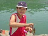 うな岸壁で釣りをすることにした。ATOMを停めてまずは腹ごしらえ。朝は「チョコワ」が最近の定番。牛乳を入れるだけなので楽チンである。朝食はあっという間に食べ終わり、それではいよいよ釣り開始。何人かおじさん達が釣っている横に椅子を出して、ちょい投げモード。しかし、海底にヘドロや海草、ゴミなどがあるようで、わたるはゴミや海草を釣っている。また、漁船の出入りも激しくて、底のヘドロが巻き上げられているようだ。漁船が傍に来たら海水が真っ黒になった。釣り座を移動することにした。先ほど見ていた船が停泊している漁港へ向かう。船の間でハゼ釣りなどでお茶を濁すつもりが、漁港の先端が空いていたので、そこで釣ることにした。しばらくするとわたるが「釣れたよ!」と。見ると15cm程度のメバルであった!ああ、またしても素敵