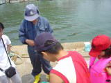 -_-)/☆(x_x) 結局そのおじさんにアジを7匹ほど頂戴した。サバも持って行って良いと言われたものの調理も大変だし、傷むのも速いので遠慮させていただき、子供にはアジを掴ませておいた。佐倉から来たおじさん、ありがとうございました。おかげさまでアジは夜においしくいただきました。さて、アジを大量にいただいたということで、魚釣りどころではなくなり、いただいたアジを急いで捌くことにした。そのため、ここで釣りは終了とし、ATOMからナイフを持ってきて岸壁でアジ捌きの開始となった。内臓とエラを取ってウロコとゼイゴを取り除く作業をする。とりあえず海水を水汲みバケツですくってバケツの水を替えながらアジを捌いた。わたるとまなにも手伝ってもらった。わたるとまなは初めて魚のエラや内臓をとったのだが、それほど抵抗はなかった様子。抱卵しているメスが2匹いて、卵を食べたかったようだが、アジの卵は食べられるのか知らないので、今回は廃棄させてもらった。ネットで見るとどうやら卵も白子も食べられるようだ。。。またチャンスがあればチャレンジしてみよう。半分ほど捌き終わったときにそれまで作業をしていた岸壁にもついに乗り合い船が戻って来てしまった。荷物をまとめて慌てて移動したが、そのあと岸壁の隅っこで続けて作業をしていたら、水くみバケツが海に落下してしまった。今回は玉網は持ってきていなかったので、拾うことができなかった。しかし、水がないと作業できないのと、魚が暑さで傷んでしまうので捌いたものをまずはATOMの冷蔵庫に入れに戻った。そして、残りのアジ用にペットボトルの水を4Lほど使って、なんとか作業終えることができた。