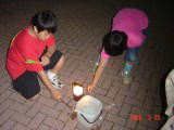 そろそろ子供たちも食事を終えたようなので、それでは花火に行きましょう。隣の公園のトイレの近くがスペースも広く、引火するものもないのでよさそうです。でもこんなに子供たちが沢山いるとは思っていなかったので、それほど沢山の花火は用意していませんでした。我が家には多すぎる量ですが、10名もの子供たちには足りなかったです。もっと大きなセットにしておく必要ありですね。また、実際に花火をしてみてわかりましたが、打ち上げ花火とか落下傘とかがあったほうが楽しかったですね。次回の参考になりました。結局うちの花火では足りなかったのでたのけよ家から立派な花火を2セット提供いただきました。打ち上げ花火まで入った立派なものでした。花火はたくまくんが仕切ってくれて全部対応してくれたので私は「ゴミ係りのおじさん」だけですみました。たくまくんの「前に倣え!
