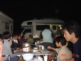 風が思った以上に吹いているので、ロの字型に車を配置して、その中にテーブル・椅子を並べて、それぞれに夕食の準備に取り掛かかる。我が家は当初豚しゃぶの予定であったが、急遽アジの塩焼きの追加である。炭をおこしておいて、炎が静まるまでの間に車内でご飯を炊いておく。しゃぶしゃぶは会社の同僚お勧めの水とお酒を半々の割合で煮立たせてアルコールを飛ばした後に、豚とほうれん草を茹でてポン酢で食べるというものであるので、ほうれん草を下茹でしておく。ほかにも豆腐なども持ってきていたが結局使うことは無かった。アジと皆様からいただいた品々でおなか一杯であった。わたるに至ってはアジを人に配っておきながら自分はソーセージや頂き物でおなかが一杯と言って、アジもメバルも食べずに終わった